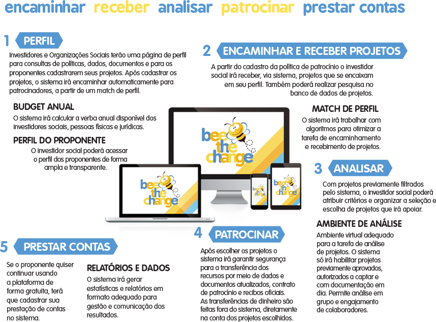 BEE THE CHANGE é uma plataforma digital que surge com o desejo de unir investidores e empreendedores sociais para a realização de projetos que utilizam incentivos fiscais no Brasil.